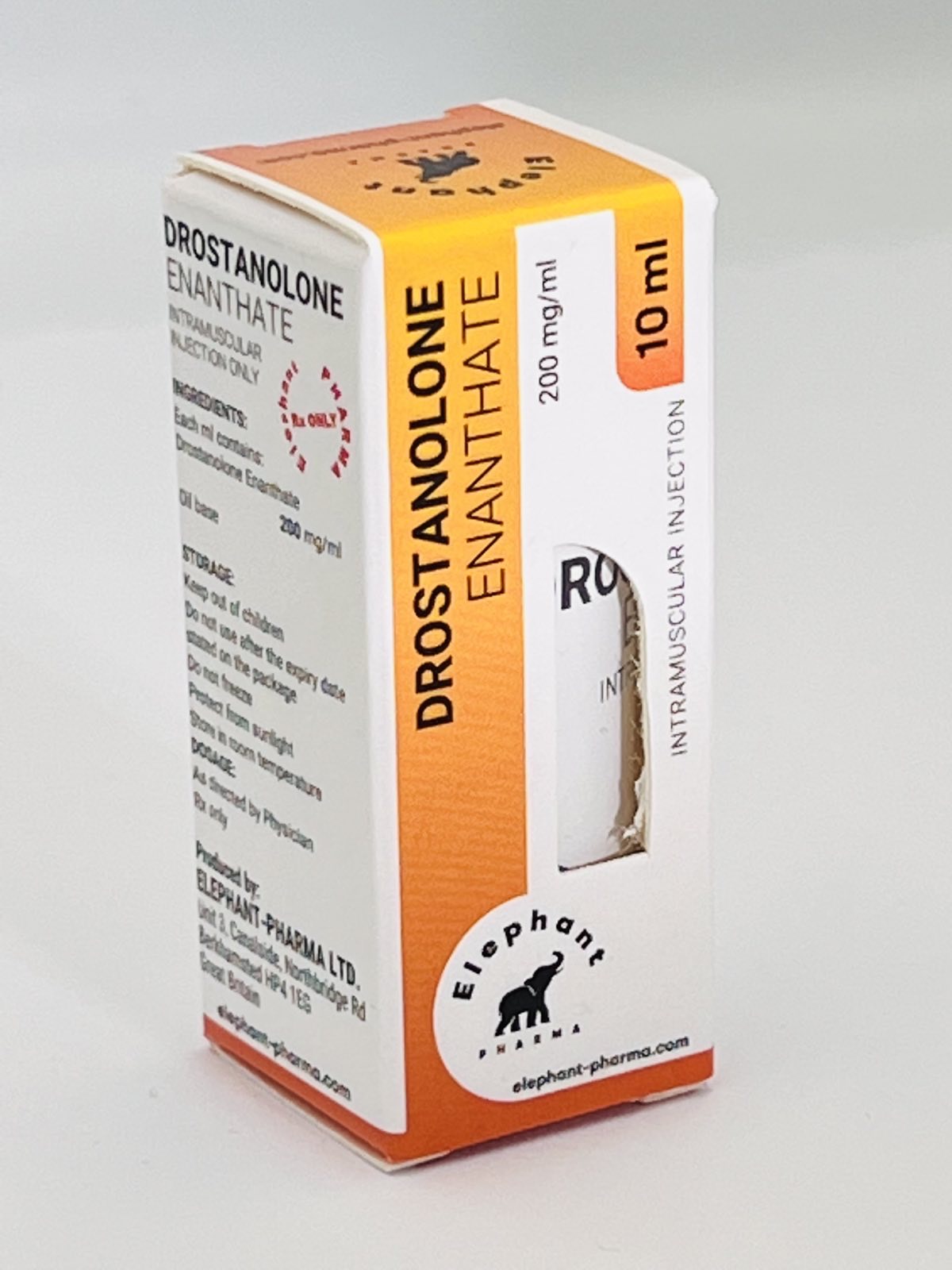 Elephant Pharma Drostanolone Enanthate, steryd anaboliczno – androgenny do iniekcji (wstrzyknięć). Preparat o stężeniu 200 mg / ml występuje we flakonach o pojemności 10 ml. Jest to steryd ceniony w środowisku kulturystów, a cechuje go praktycznie zerowa aromatyzacja (brak konwersji testosteronu w estrogen). W tej opcji do Drostanolone dołączony jest długi estr Enanthate, który pozwala uniknąć częstych iniekcji.